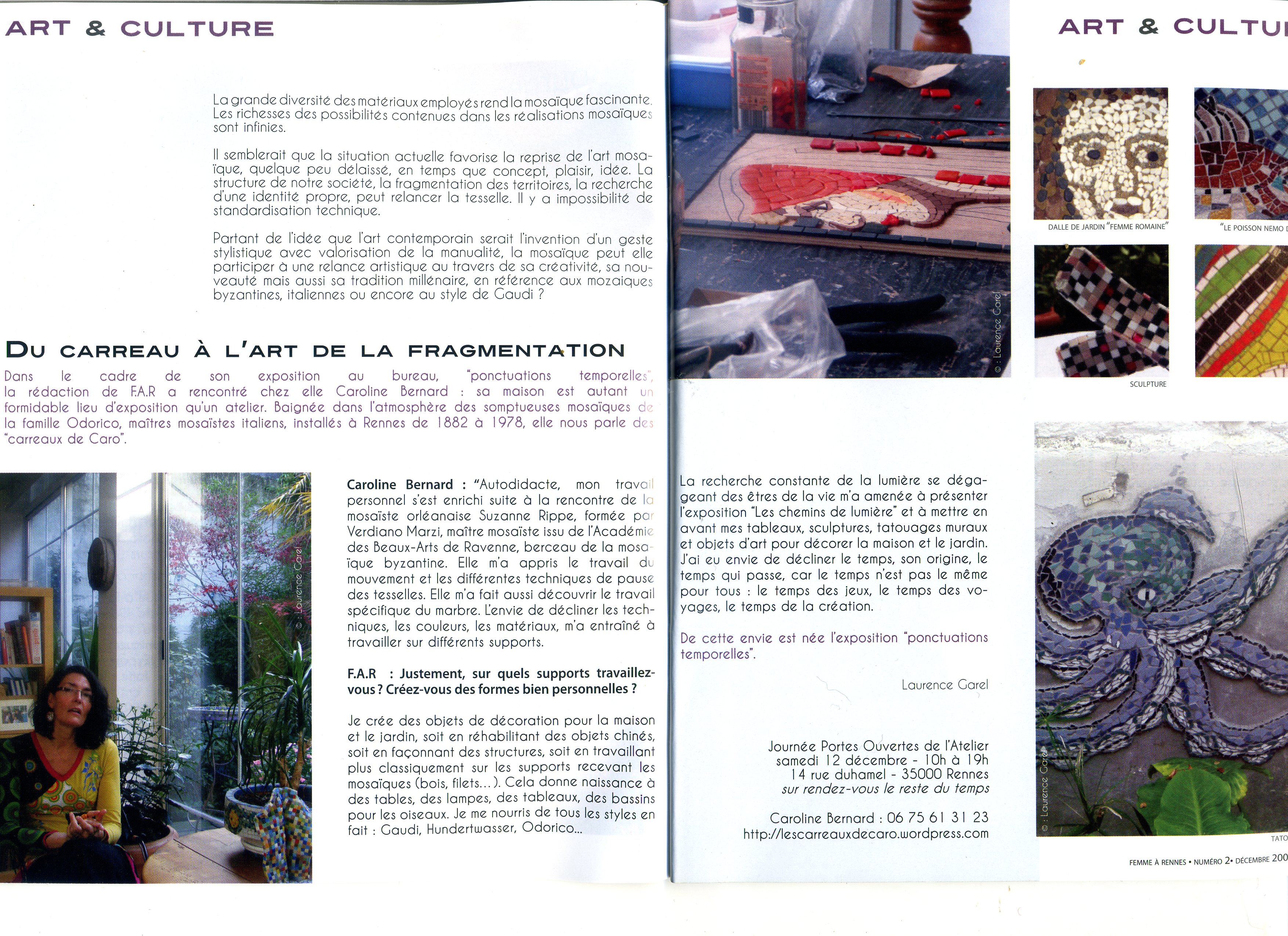 Suite à la parution de l’article sur mon travail dans « Femme à Rennes », le magazine féminin urbain du mois de décembre, je vous ouvrirai la porte de mon atelier